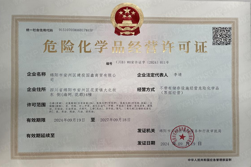近日,綿陽(yáng)安州礦產(chǎn)資源集團(tuán)有限公司全資子公司綿陽(yáng)市安州區(qū)建投國(guó)鑫商貿(mào)有限公司(以下簡(jiǎn)稱“國(guó)鑫商貿(mào)”)順利取得《危險(xiǎn)化學(xué)品經(jīng)營(yíng)許可證》。