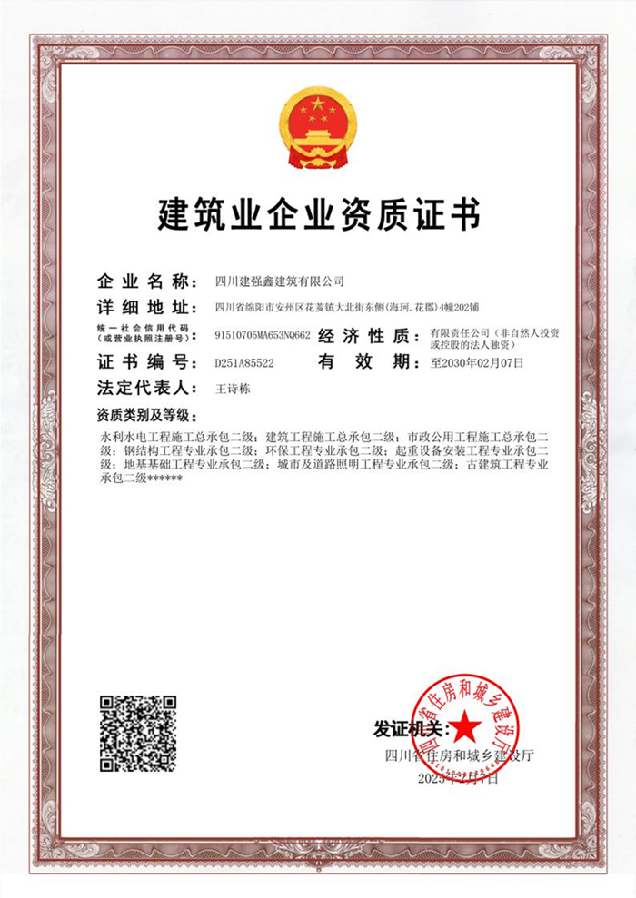 近日,經(jīng)四川省住房和城鄉(xiāng)建設(shè)廳核準(zhǔn),四川建強鑫建筑有限公司(以下簡稱“建強鑫公司”)建筑、水利、市政施工總承包貳級資質(zhì),以及多項專業(yè)承包貳級資質(zhì)順利通過了延續(xù),并成功換取新證。